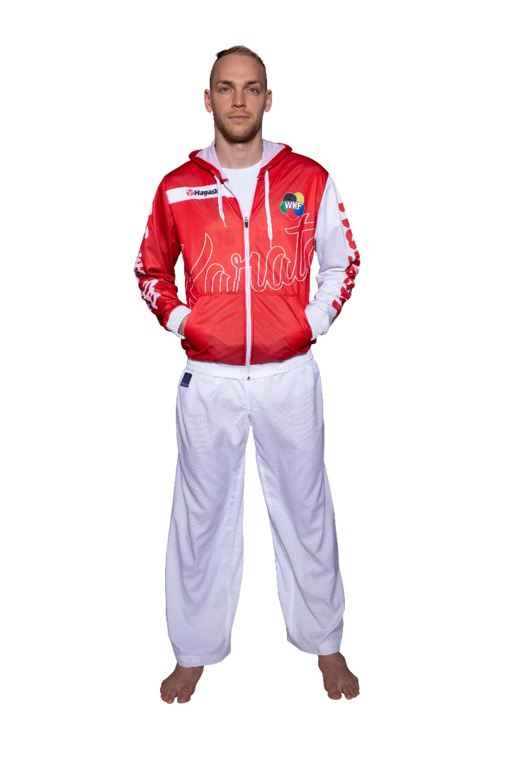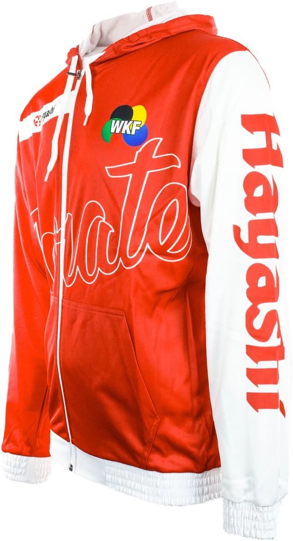 For something very special, this jacket certainly makes its unique design. The gaudy WKF brick red forms the basis for the high-quality color prints of Hayashi and the World Karate Federation.
