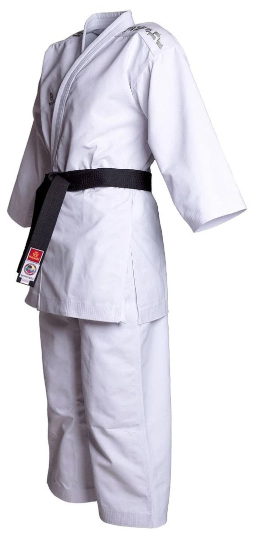 What the old masters already knew was correctly implemented by Hayashi in karate gi “Bunkai.” The extra heavy cotton blend convinces with stability and a high structural density. Moisture can be absorbed so quickly and is discharged to the outside. The noisy material also ensures an impressive snap effect on the mat. The “Bunkai” is a competition Gi for the kata area and made in traditional Japanese cut. The generous length of the Uwagi, with its side slits, falls well over the trousers. With an extra-wide crotch, this ensures maximum freedom of movement. The absolute highlight of the “Bunkai” is the Hayashi gloss embroidery in either white, red or blue, which can be seen in the shoulder area, on the chest, and in the neck.