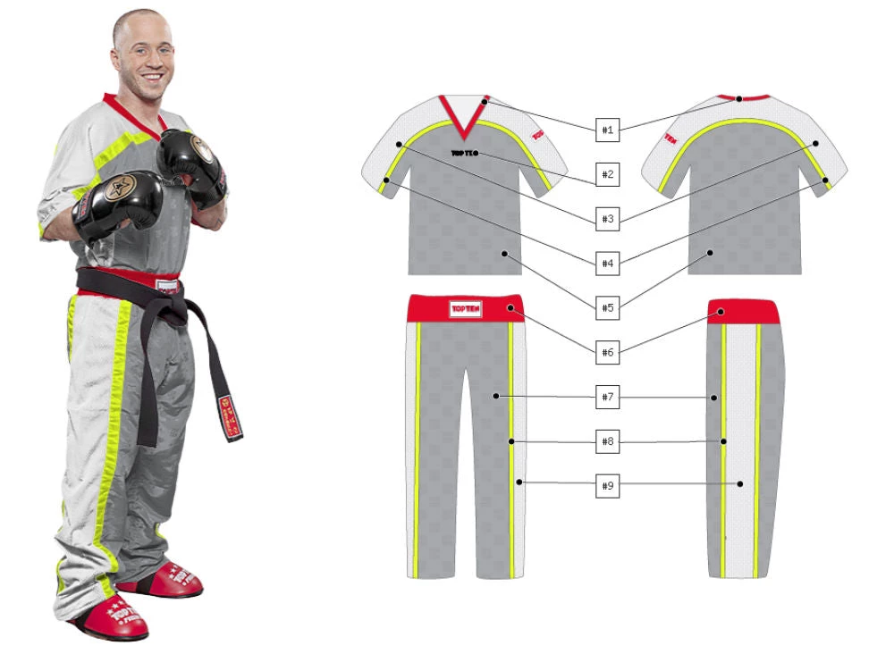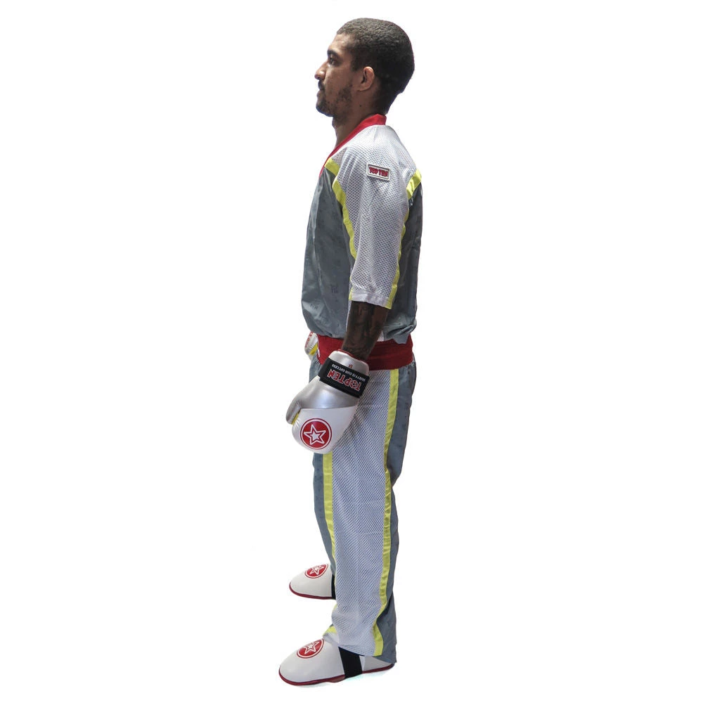 A wide flexible mesh strip extends across the entire uniform top and around the enhanced elasticity V neck. Then extends from under the arms through flank side area to the hips, providing way cooler side ventilation with maximum flexibility compared to old school solid style! Adding to the increased upper body ventilation in the top, the pants provide greater air flow and cooling through a wide mesh side strip extending from the wide elastic draw string tie waistband to the cuff. A gusseted groin allows room to wear groin protectors and have freedom of movement when performing leg and knee techniques. Additional shiny satin strips along the top and pants mesh reinforce the ultra light material for added strength, durability, and flash as you execute….