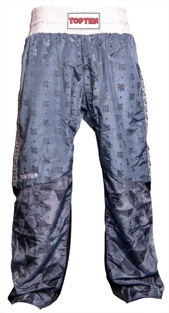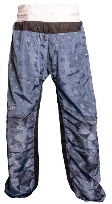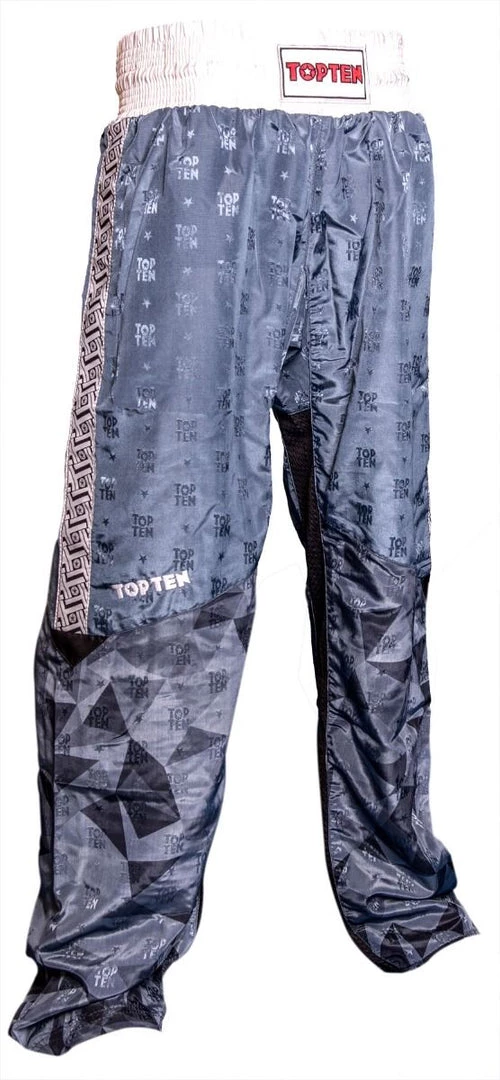 Brings together what belongs together. The long “Prism” kickboxing pants by TOP TEN combine comfortable casualness with the demands on functional sportswear. There is also an incomparable style with a graphic “Prism” print and a woven TOP TEN structure. The straight cut of the pants has an extra kick insert in the crotch so that the “Prism” can withstand extreme loads. The mesh inserts in the inner leg area and on the back waistband ensure great wearing comfort. A special dividing seam sets a visual accent and guarantees a comfortable fit on the leg without twisting or sliding up. The finishing touches for an athletic look are brought to the “Prism” kickboxing pants by the woven tape on the outer seam.